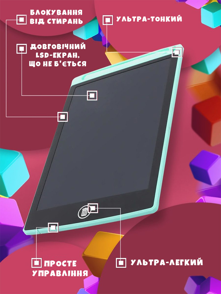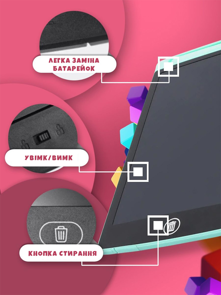 При натисканні на кнопку очистити планшет повністю видаляє намальоване, без слідів, можна робити новий малюнок або напис.